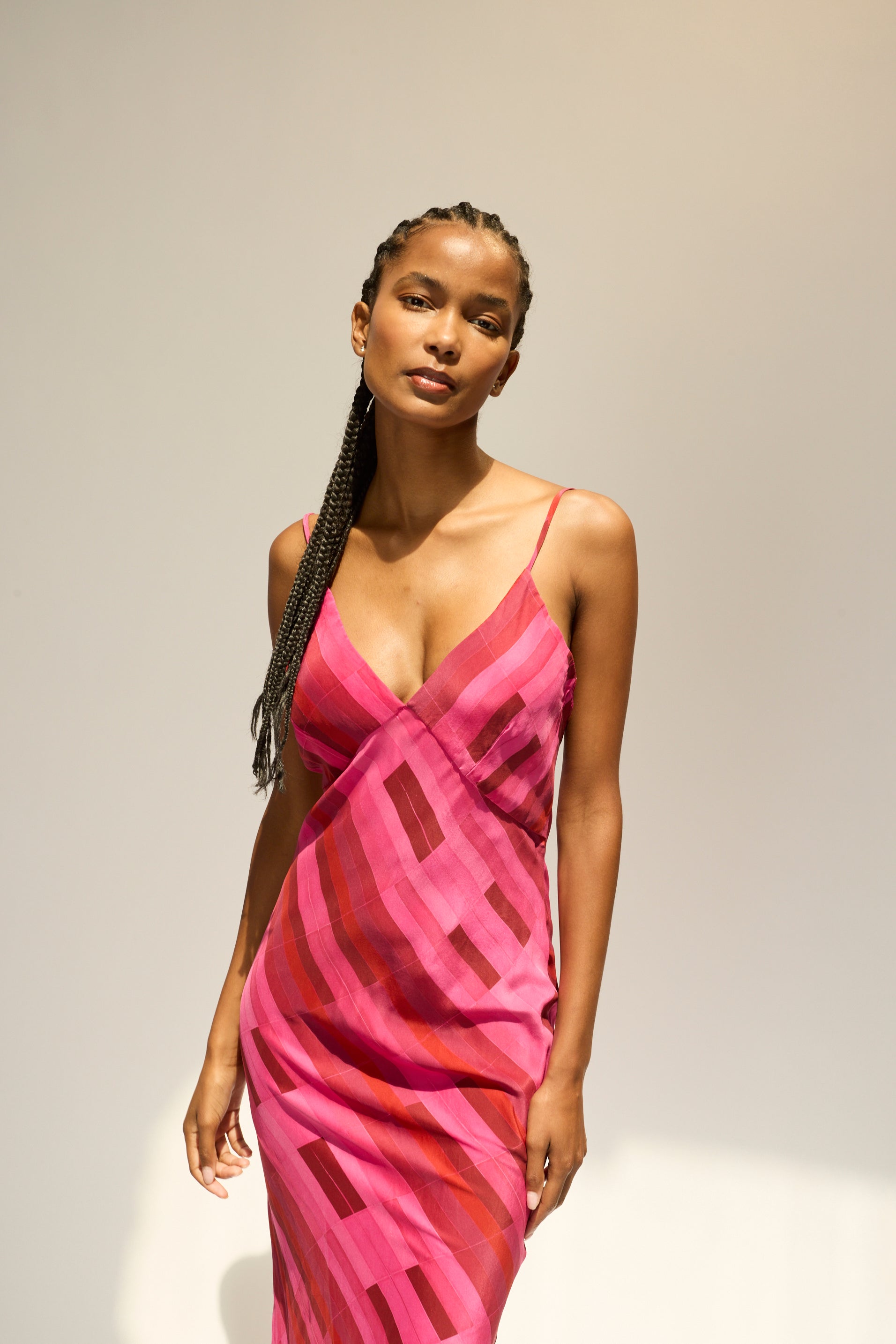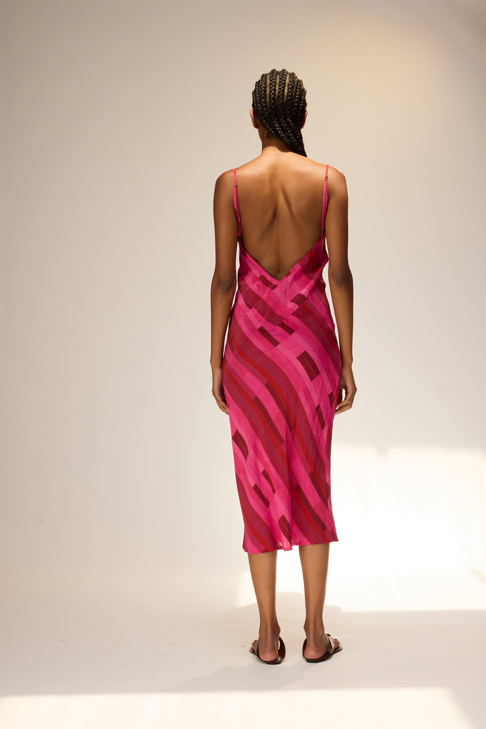 Midi-length backless slip dress featuring spaghetti straps and plunging v-neckline.