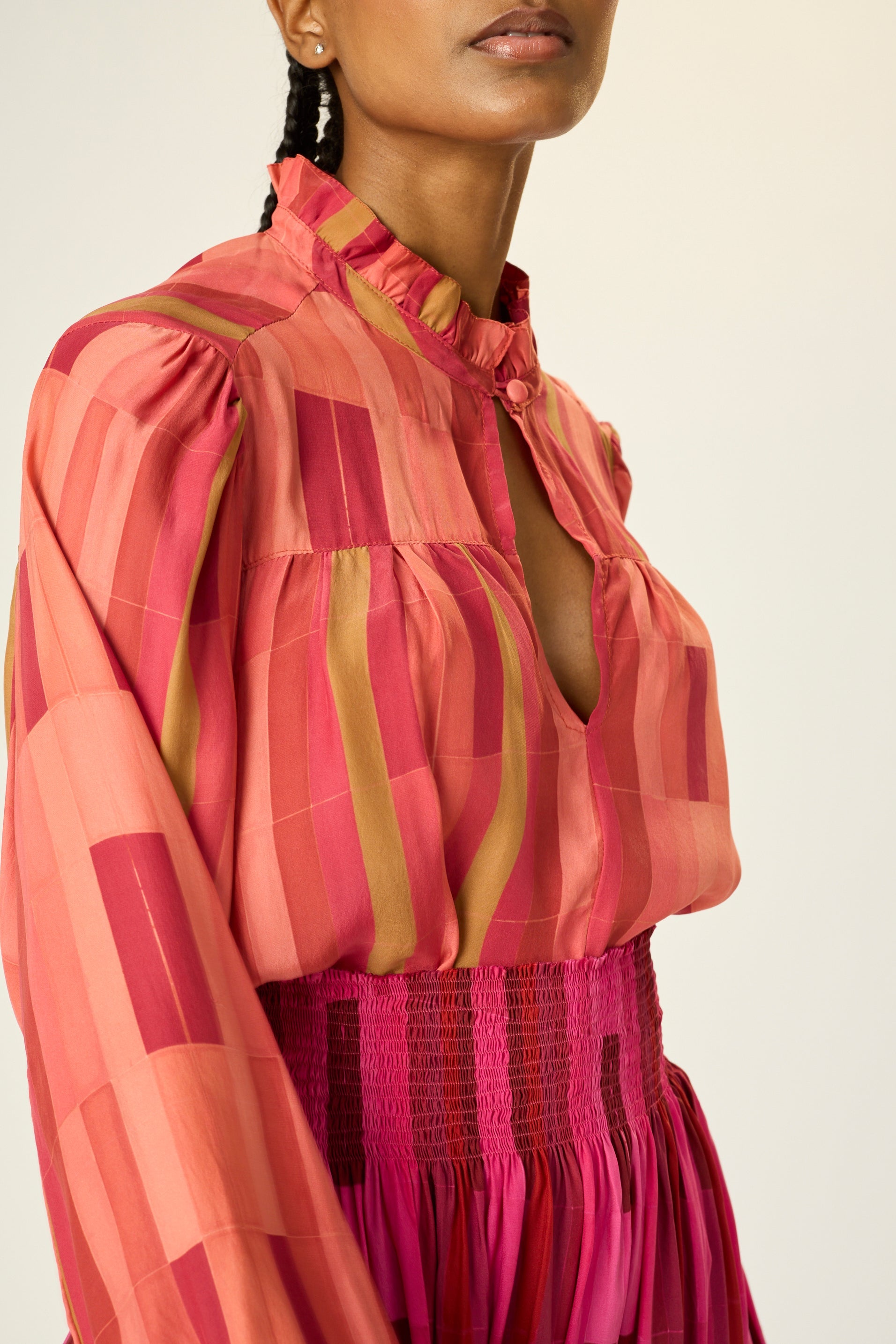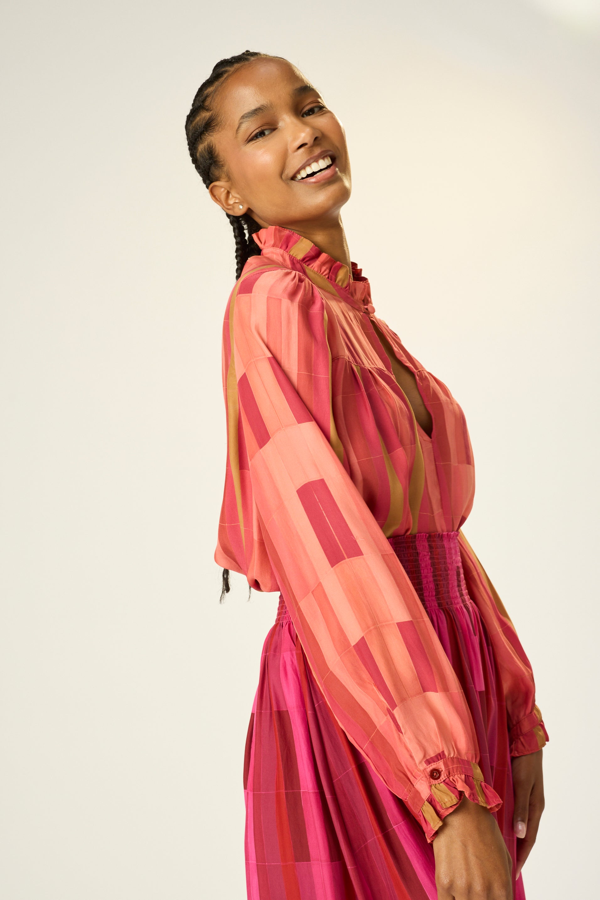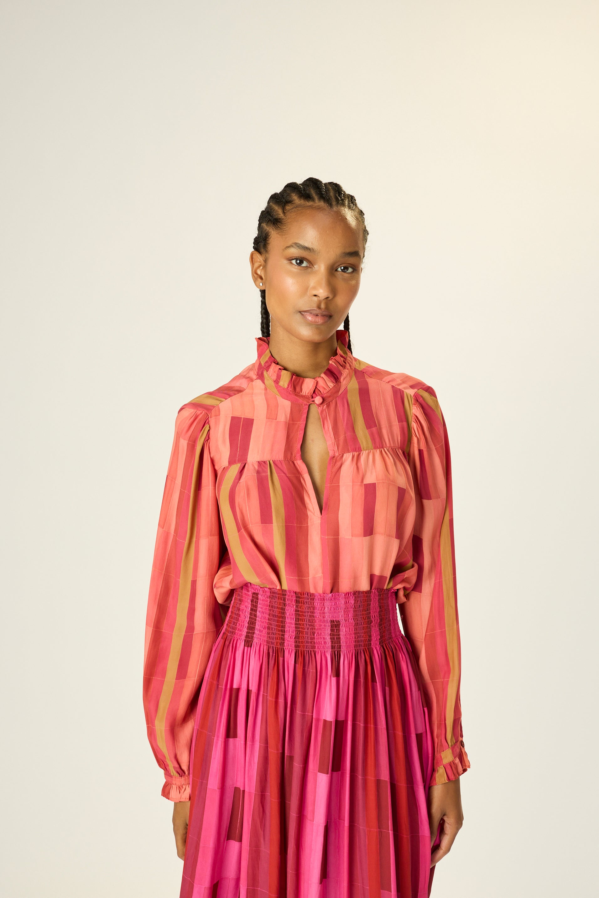 Flowy blouse with voluminous sleeves and button closure at wrist.