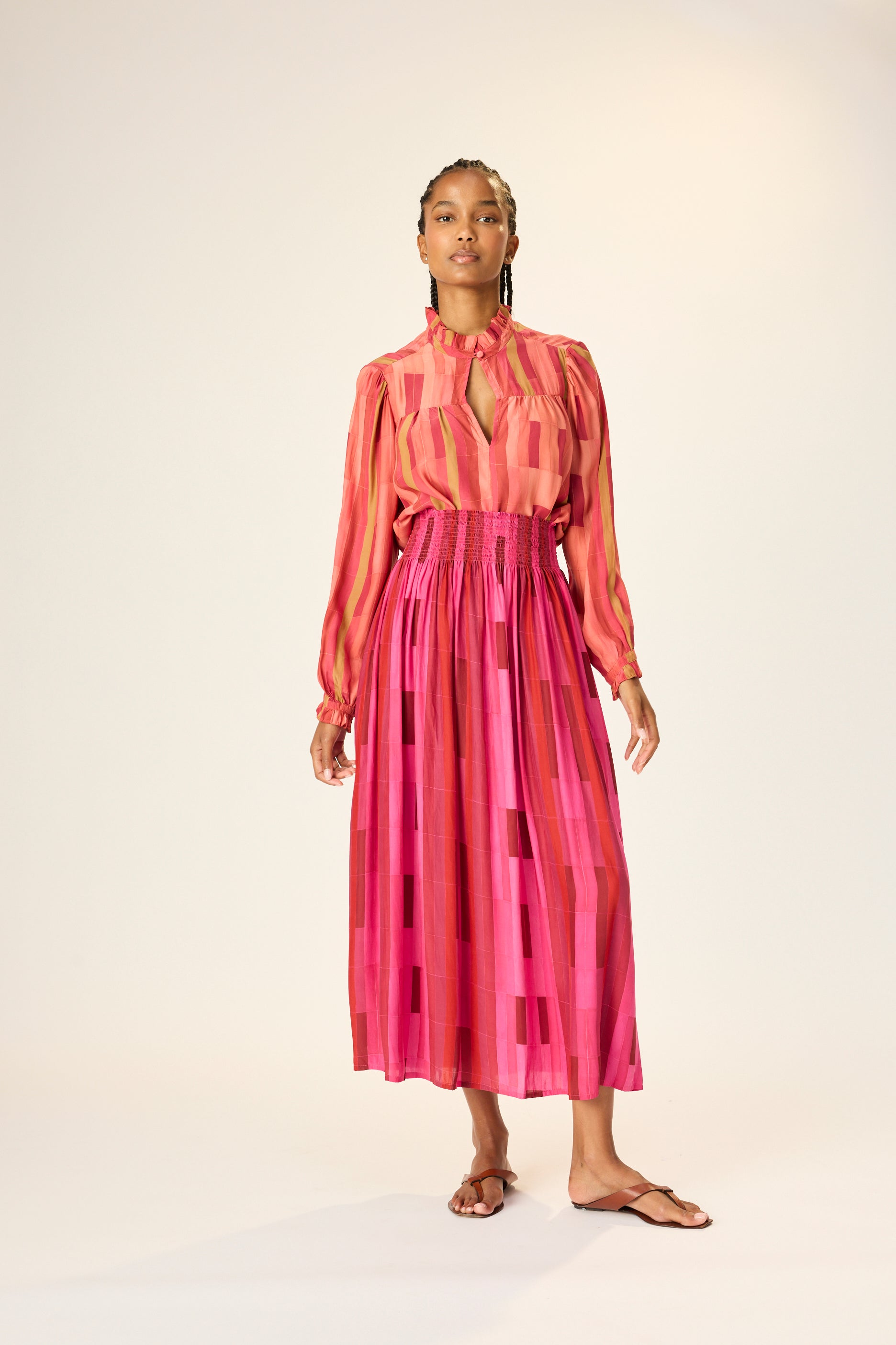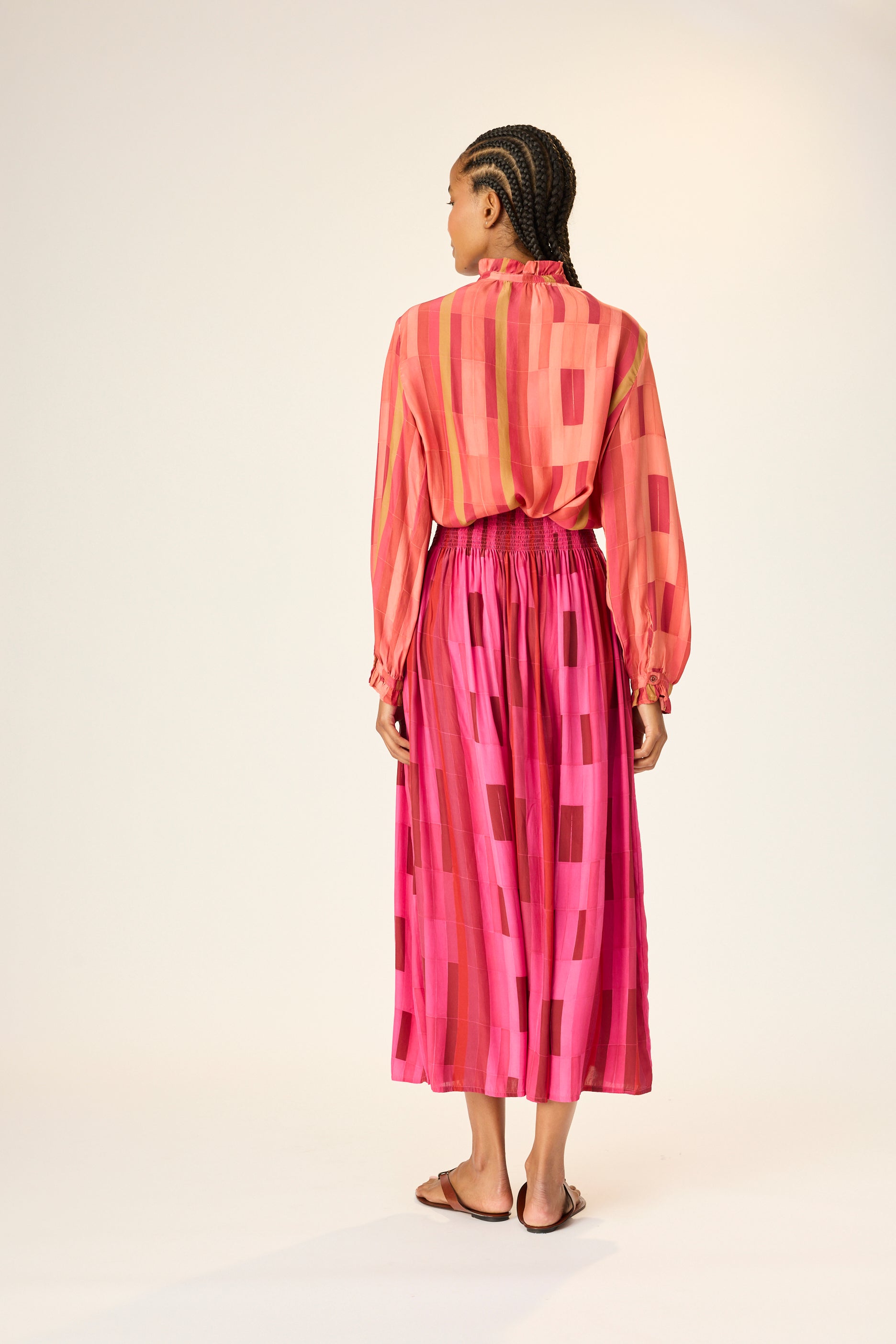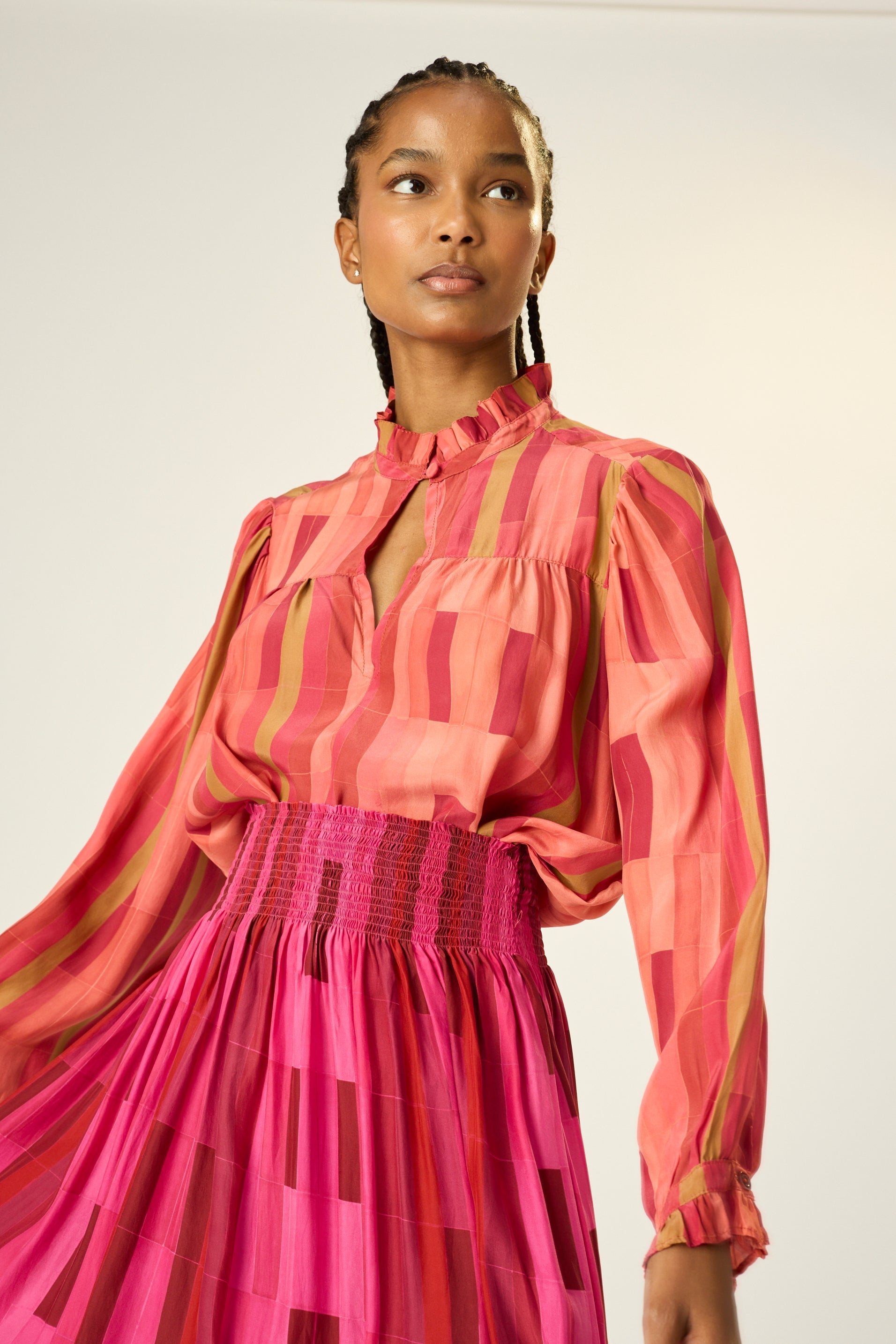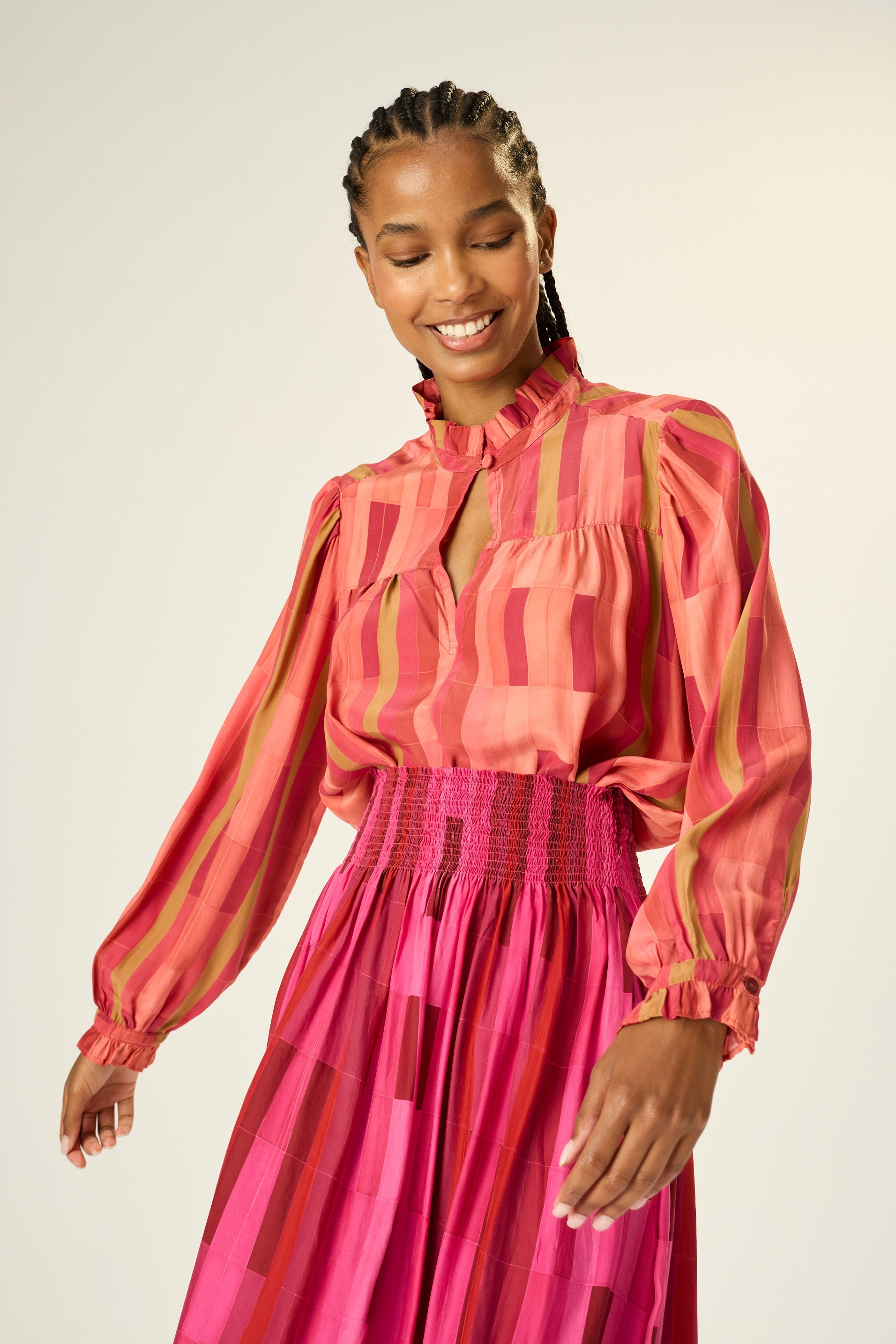 Flowy blouse with voluminous sleeves and button closure at wrist.