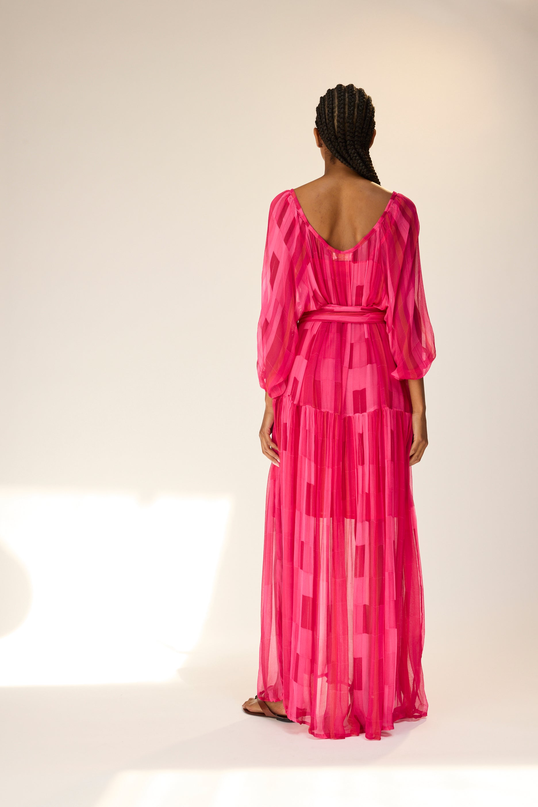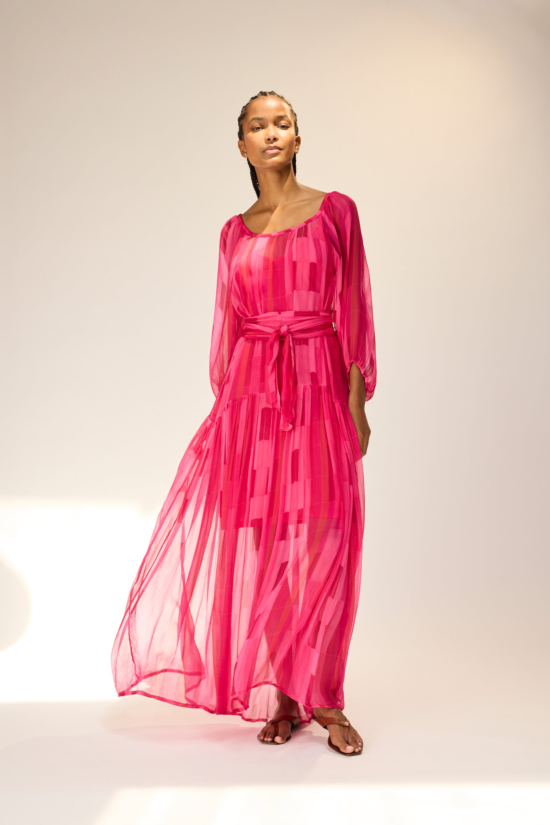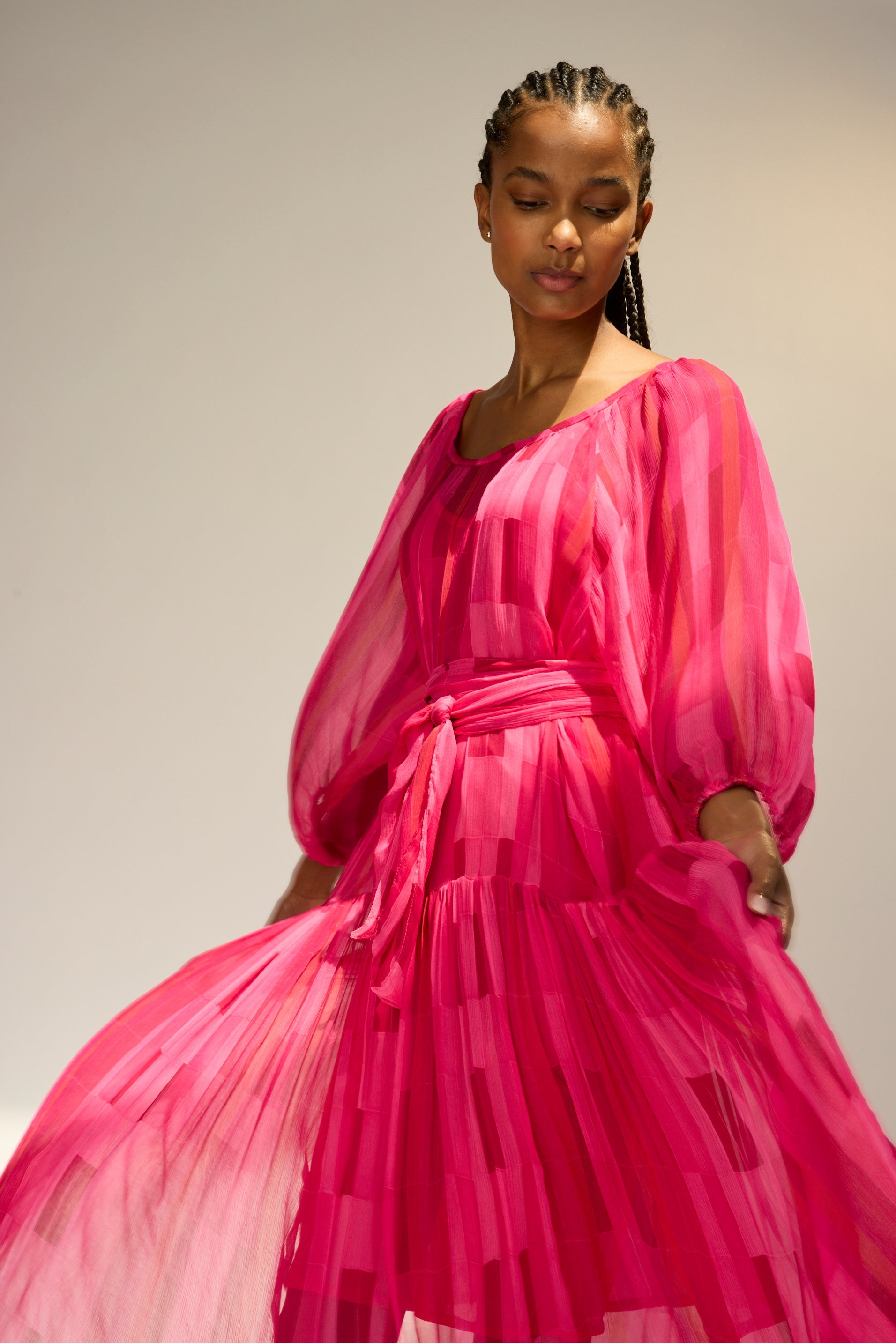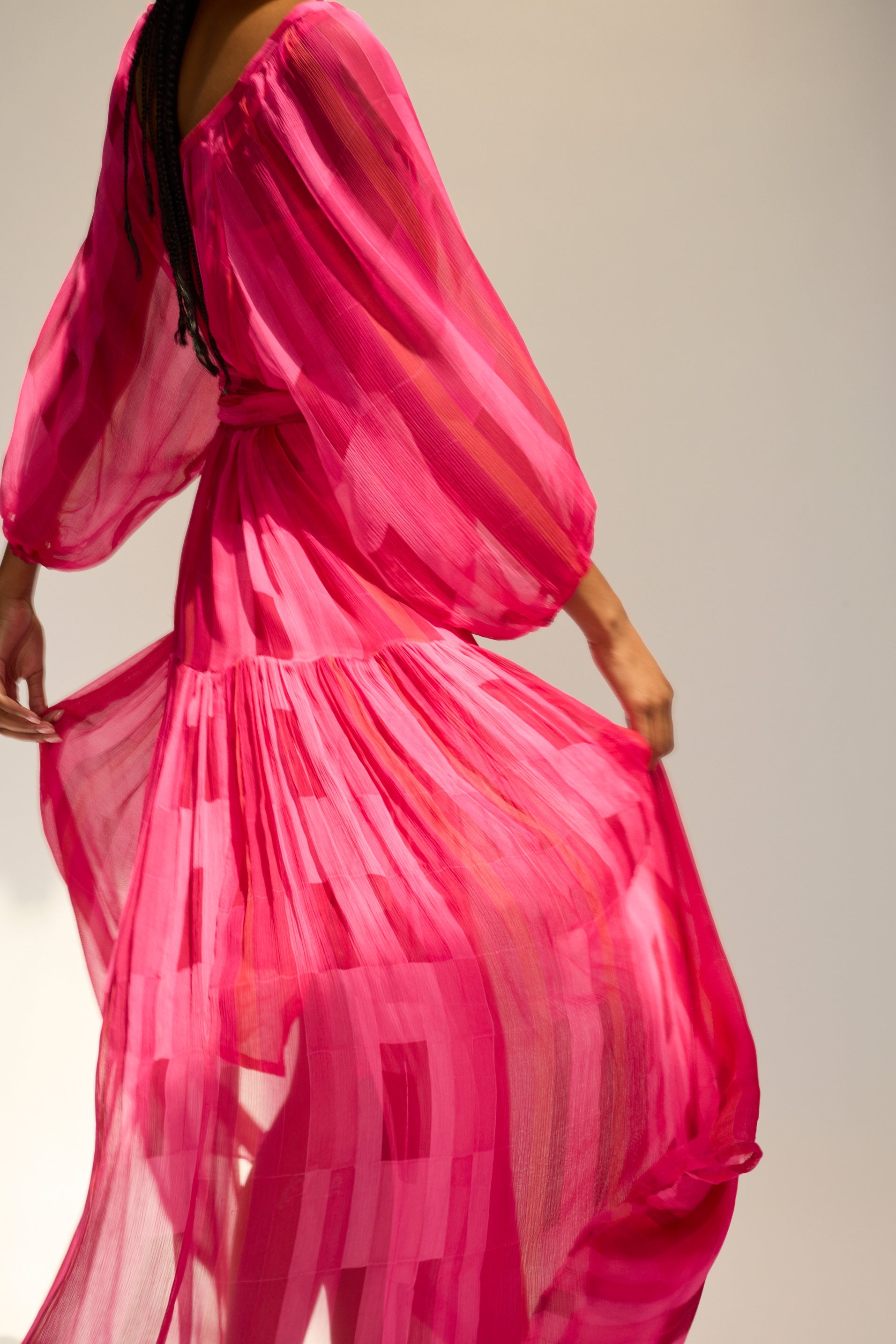 Flowy maxi dress with tiered bodice and voluminous long sleeves.