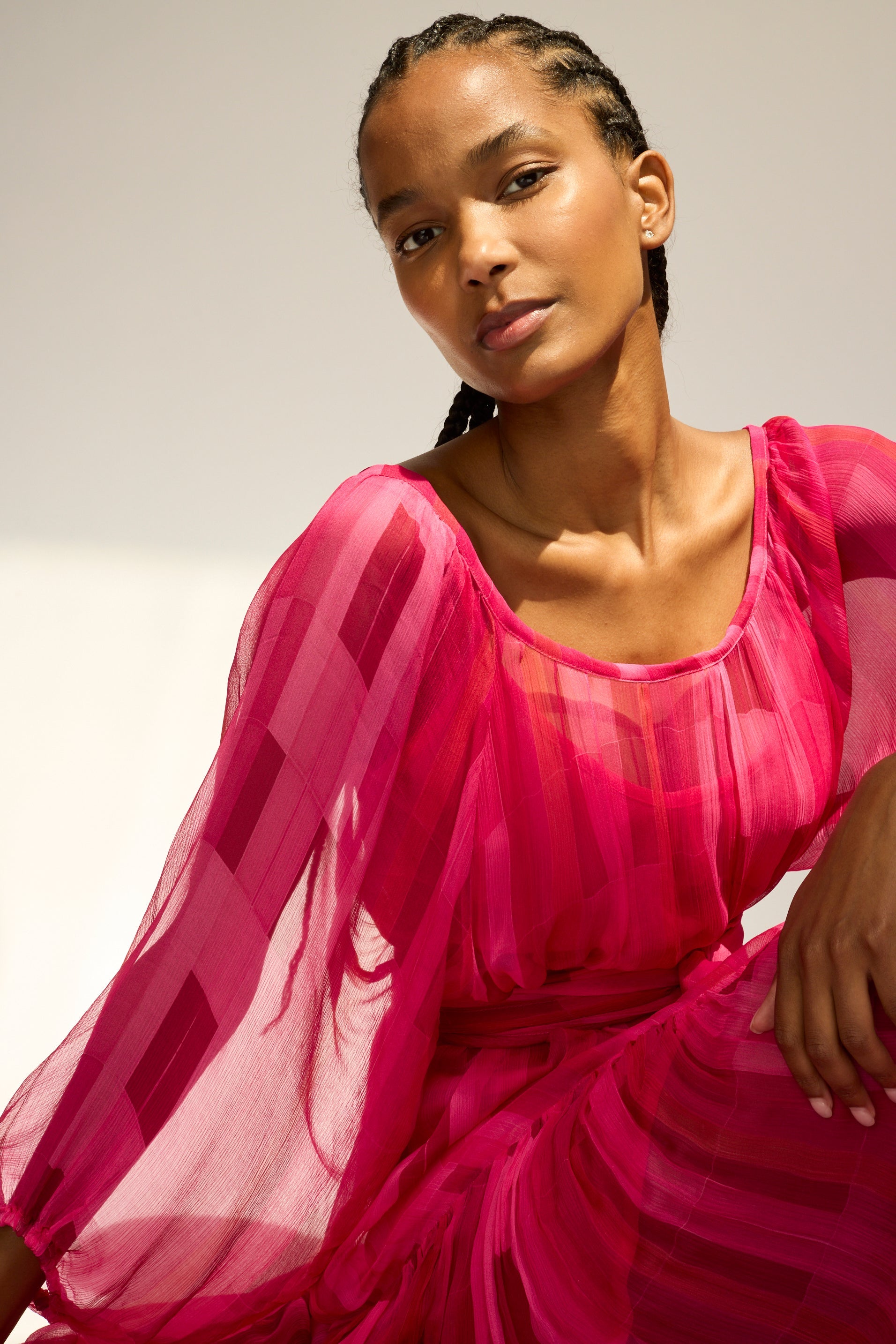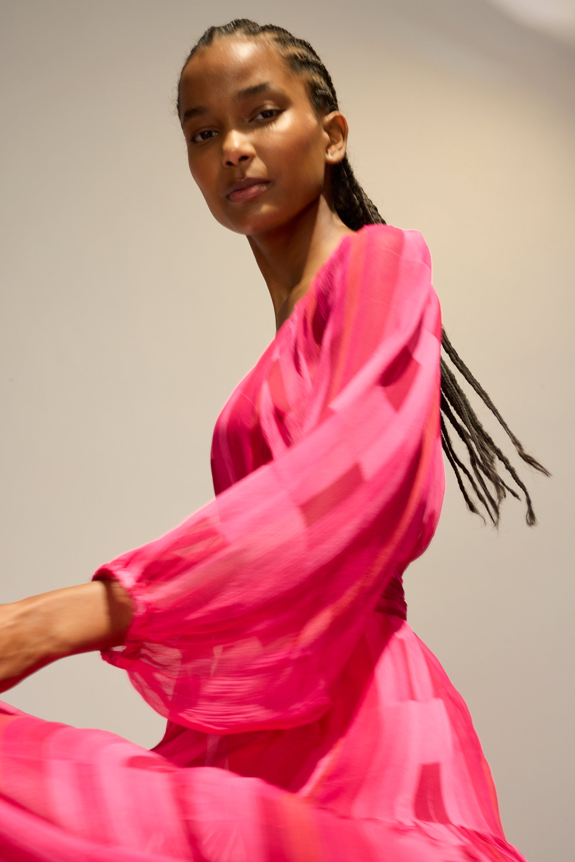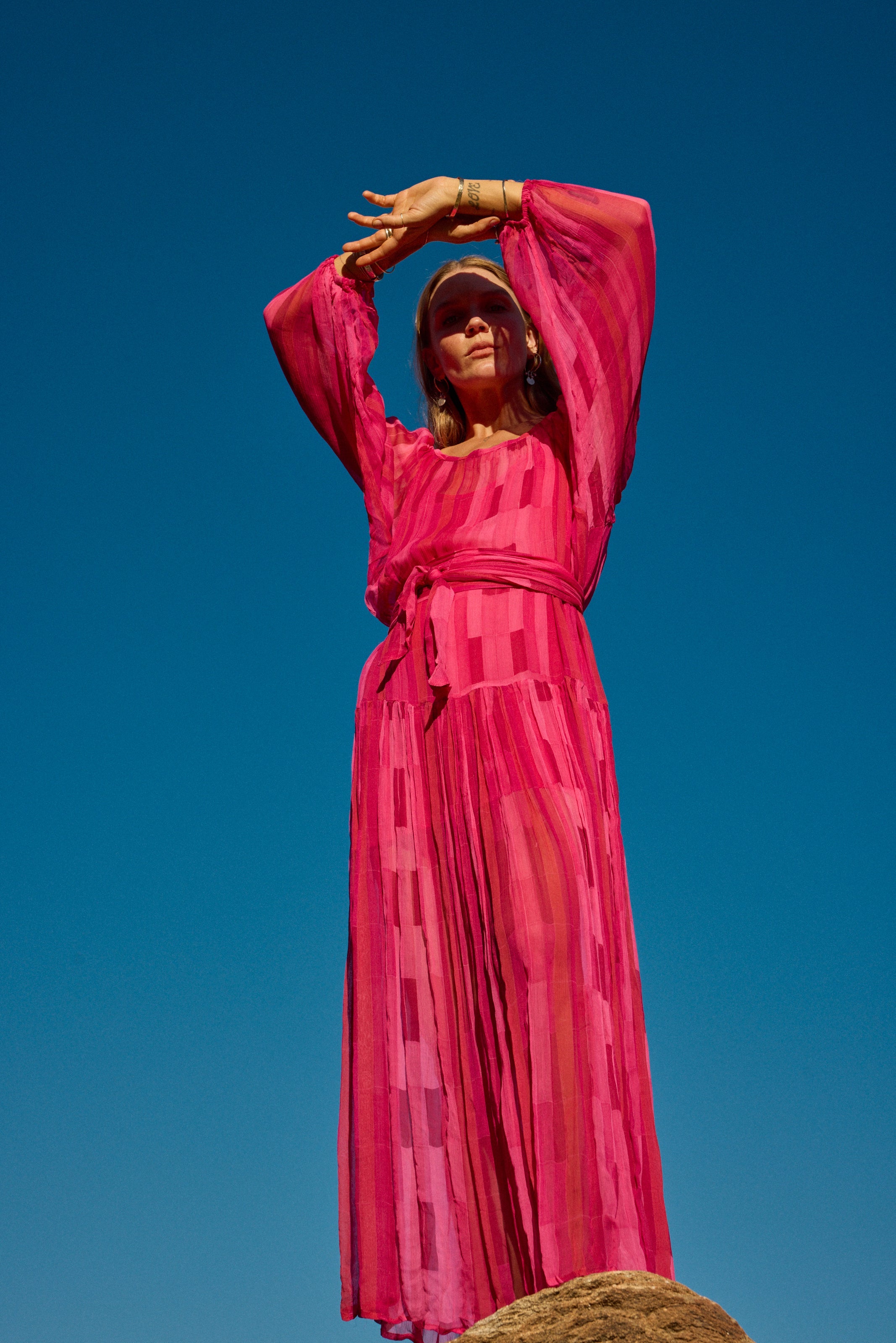 Flowy maxi dress with tiered bodice and voluminous long sleeves.
