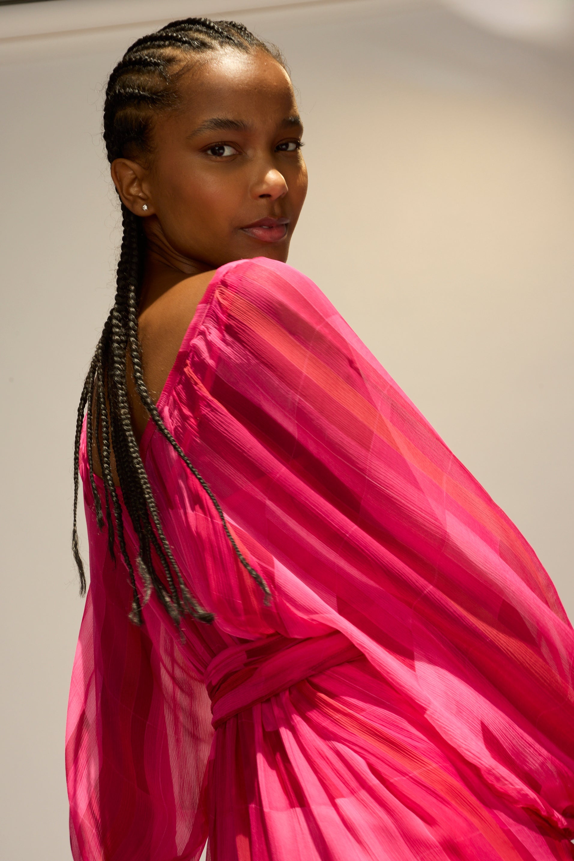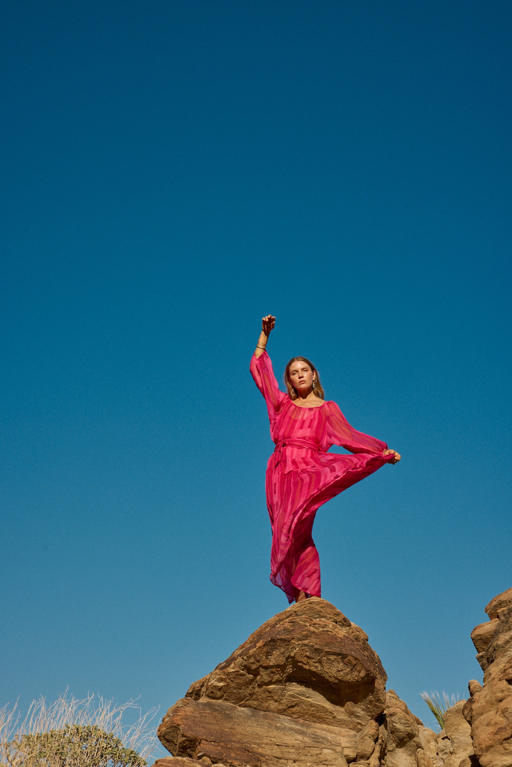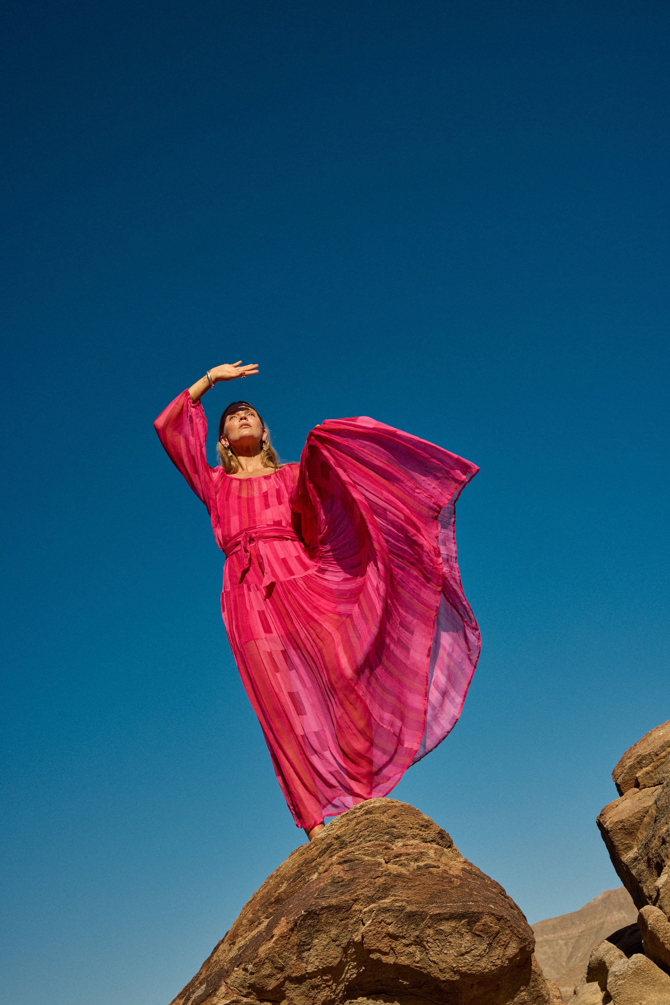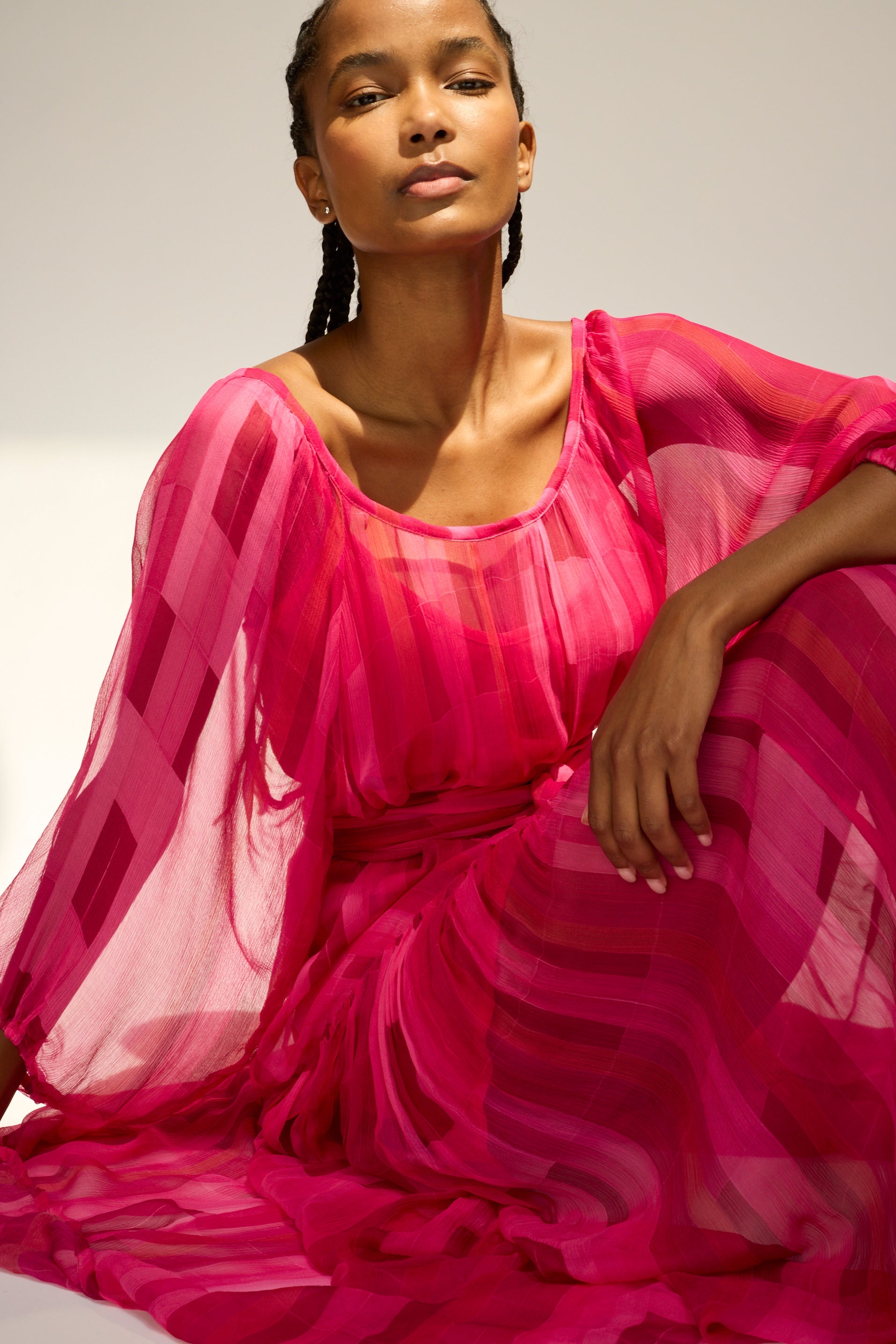 Flowy maxi dress with tiered bodice and voluminous long sleeves.