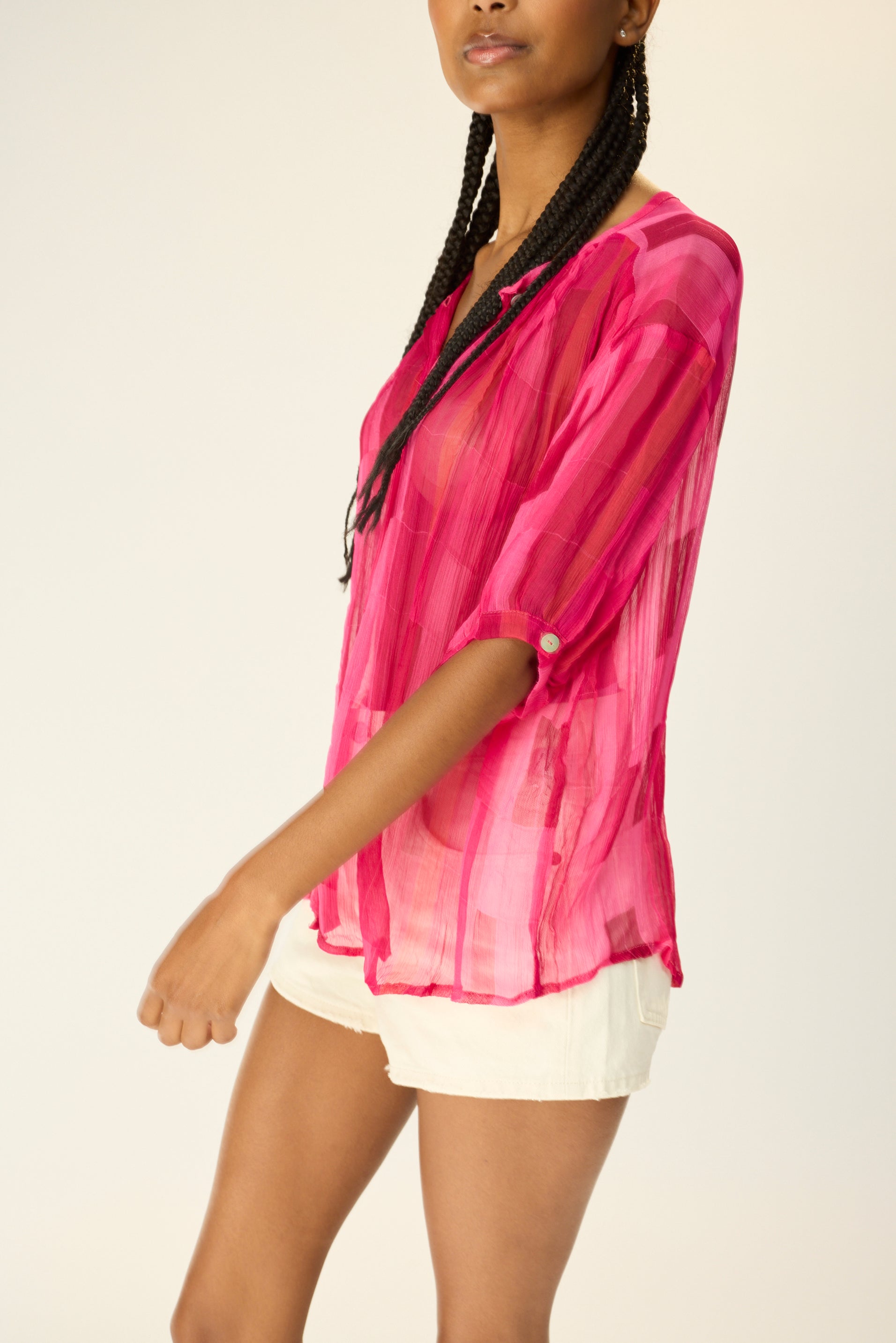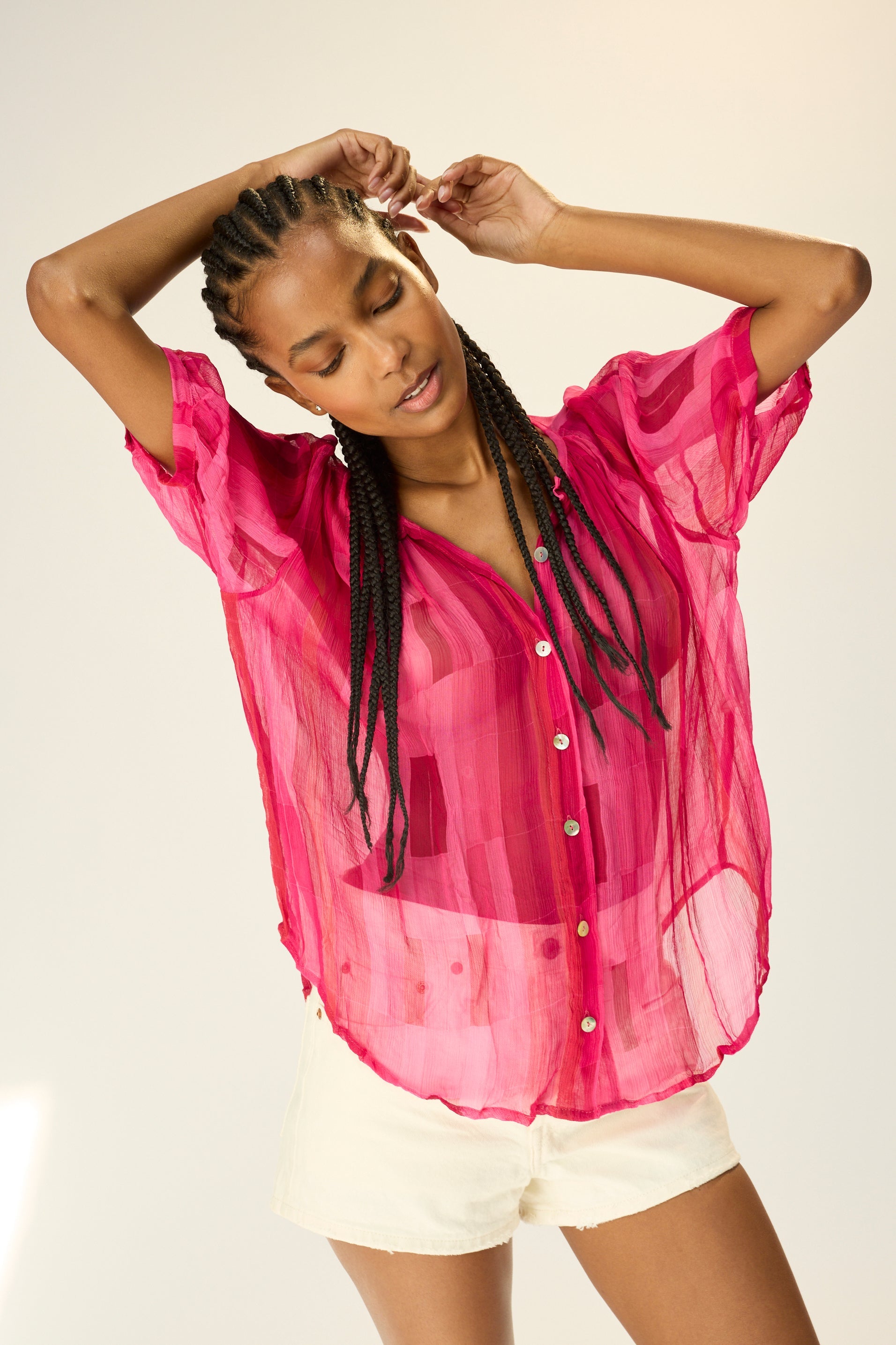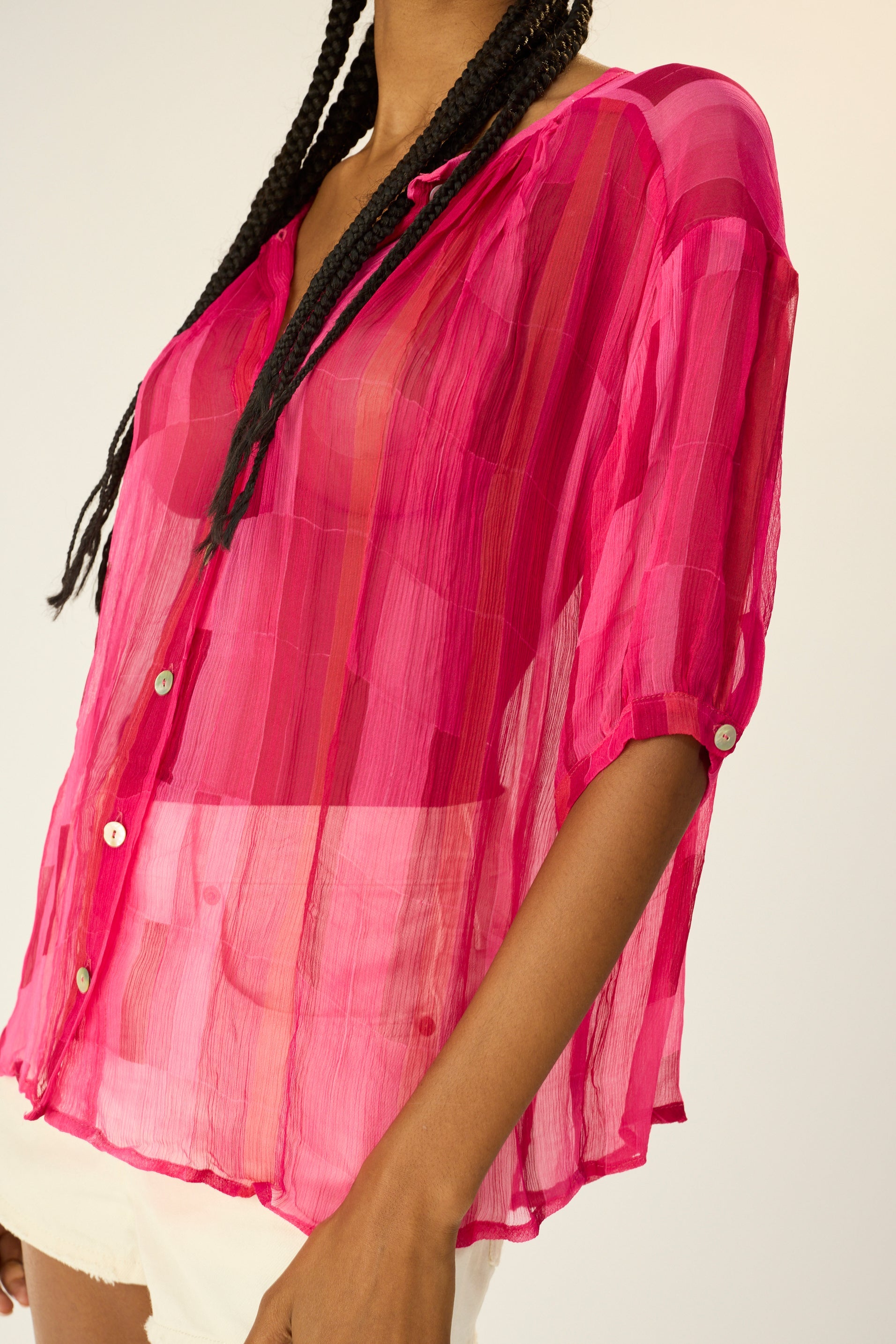 V-neck blouse with shell buttons.